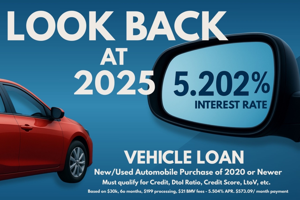 At Boonville Federal Savings Bank, we’re helping you take the wheel with confidence. For a limited time, you can “look back” at 2025 and secure a special 5.202% interest rate on qualifying new or used vehicle purchases (2020 models or newer).